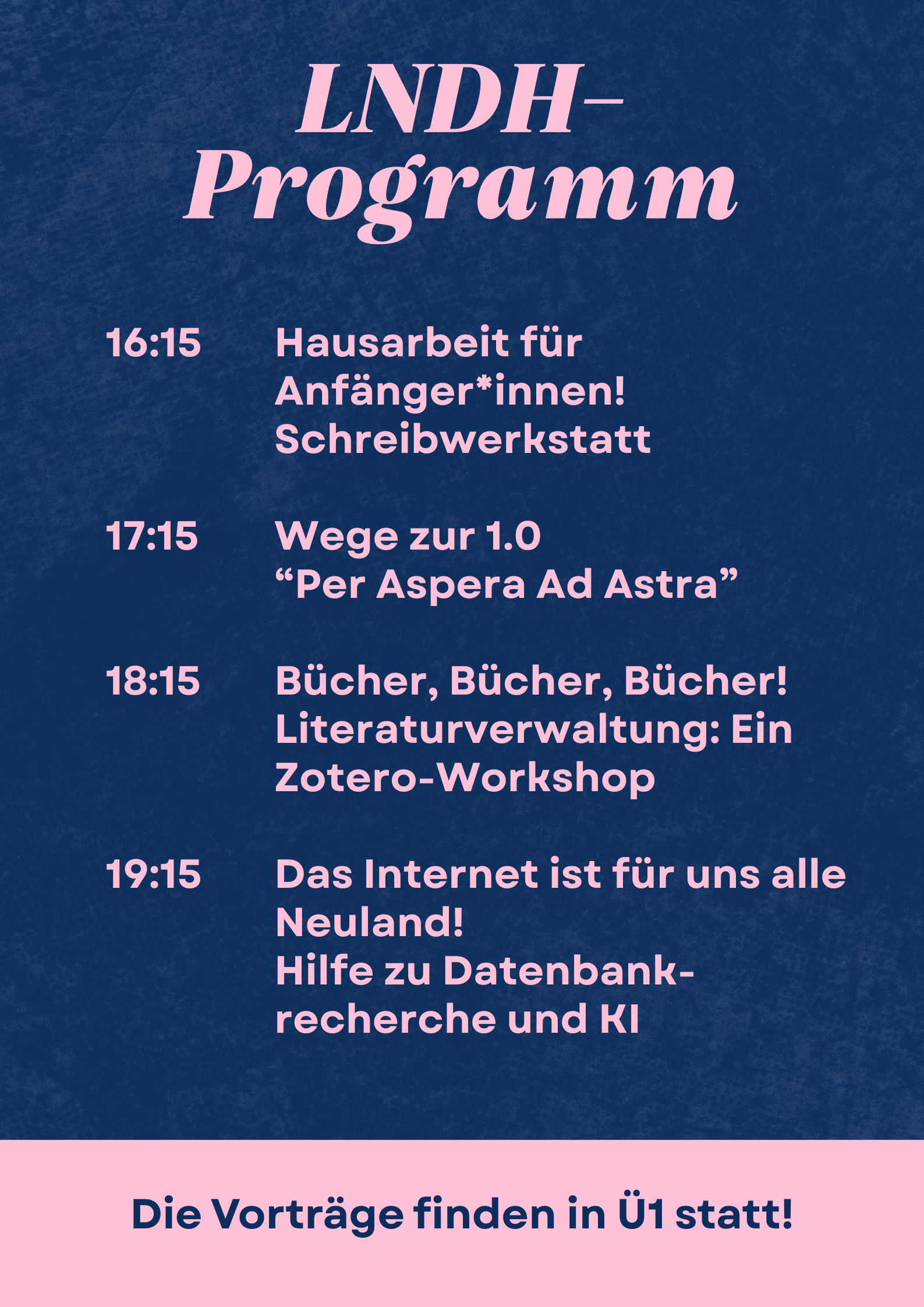 die Vorlesungen sind vorüber, doch die Köpfe rauchen weiter! Hausarbeiten wollen konzipiert, Abgaben vollendet werden. Dafür gibt es dieses Semester wieder eine LNDH: